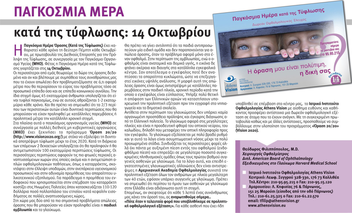 Άρθρο για τη Παγκόσμια Ημέρα κατά της Τύφλωσης και τη σημασία της προλυπτικής οφθαλμολογικής εξέτασης από τον κ. Θεόδωρο Φιλιππόπουλο, MD.